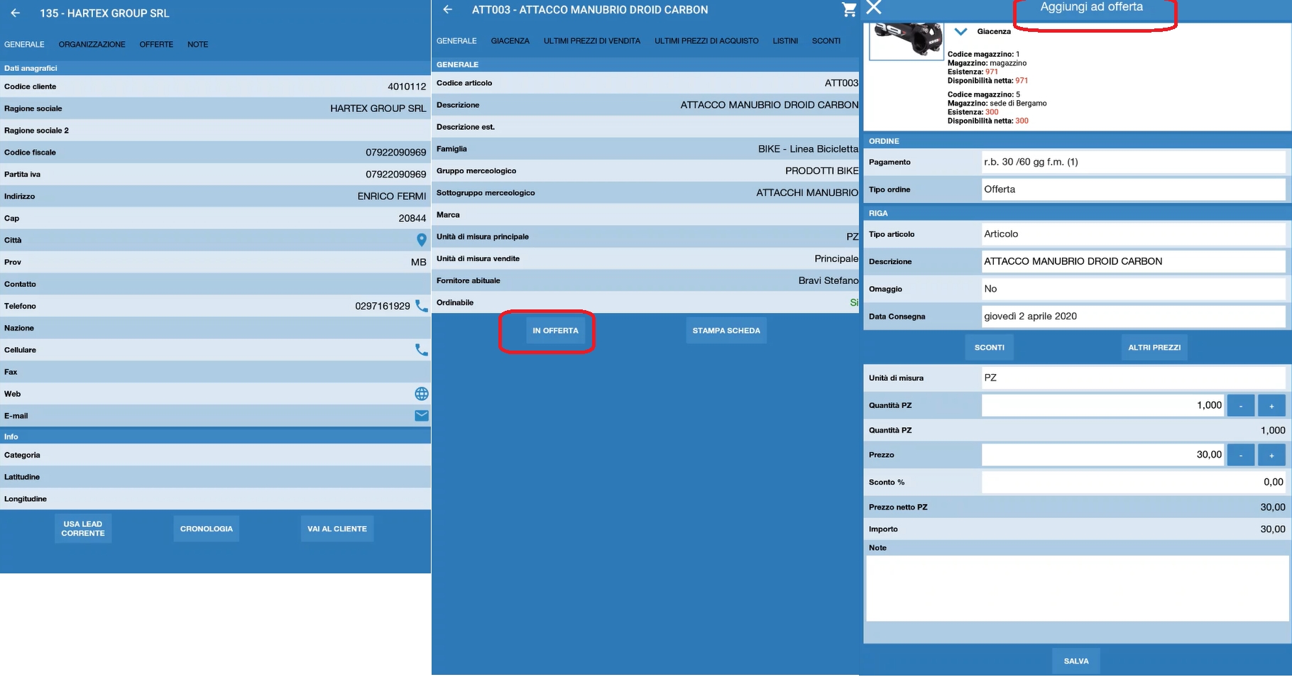 Per inserire una offerta si procede come per l'inserimento di un ordine, con la differenza che deve essere selezionato un Lead invece di un Cliente.