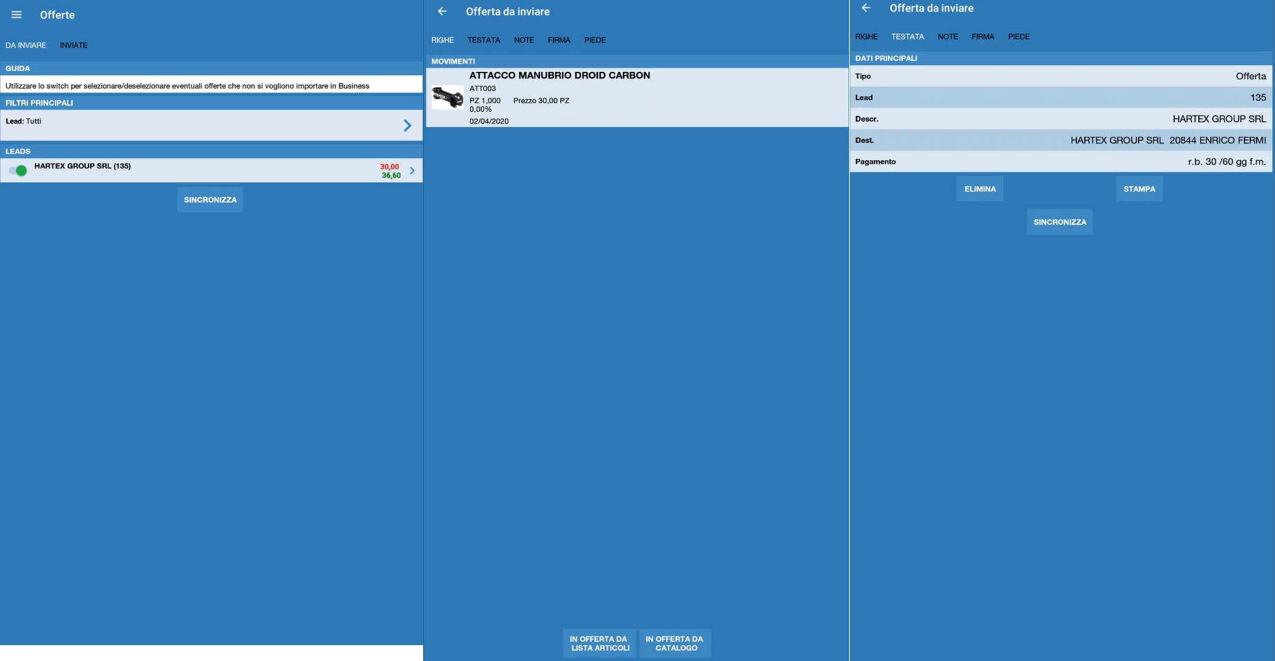 Andando nel relativo menu Offerte, č possibile visualizzare, modificare, eliminare e sincronizzare le offerte come per la sezione Ordini.
