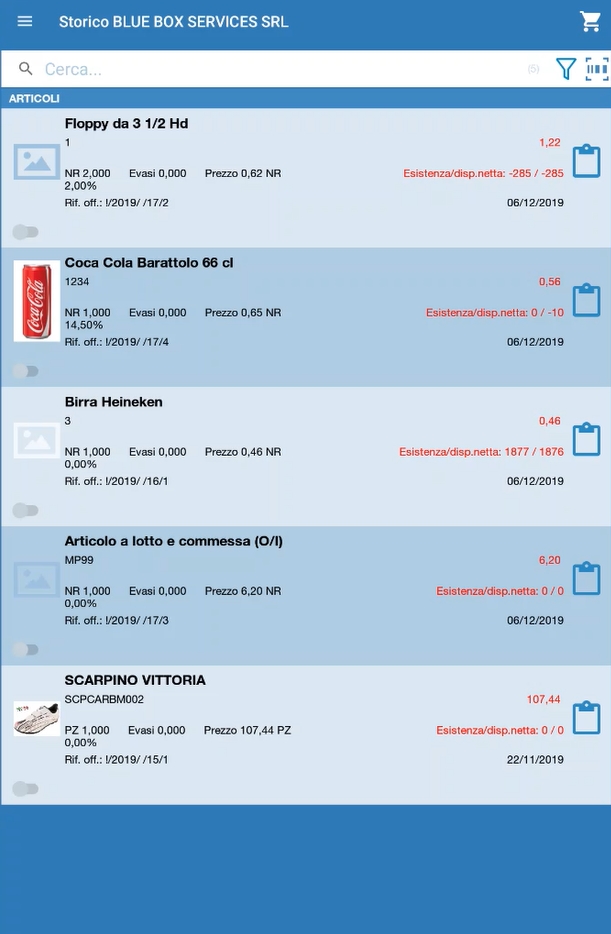 Lo storico delle offerte visualizza gli ultimi articoli utilizzati nelle offerte inviate al Lead, in modo da poterli riutilizzare velocemente per le offerte successive.