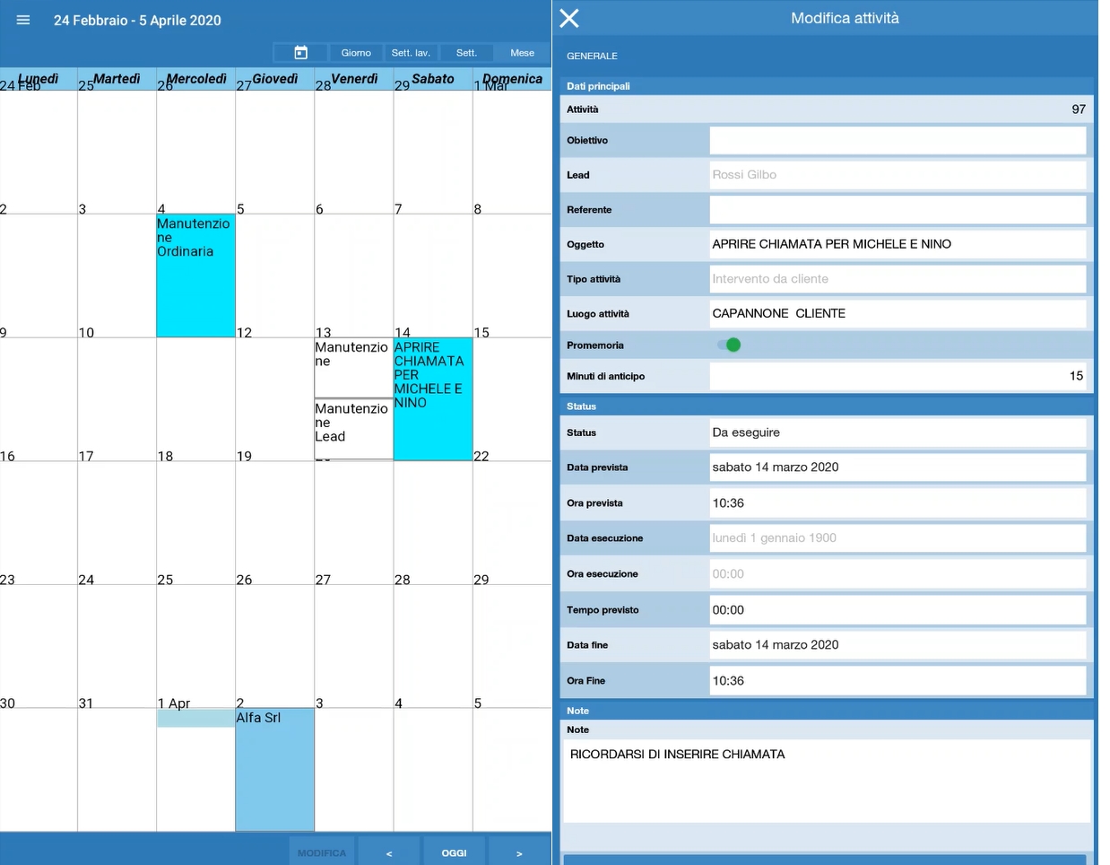 L'agenda gestisce anche le attivitą del CRM in aggiunta a quelle del customer service, cliccando sull'attivitą č possibile attivare il tasto di 'Modifica' dell'attivitą stessa.