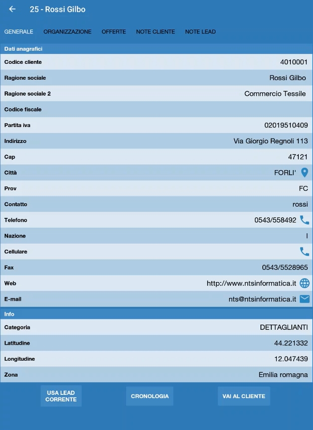 Aprendo l'anagrafica di un lead sarą possibile visionare i dati, attivare la navigazione verso il lead, contattare il lead, ecc. (come per i clienti).