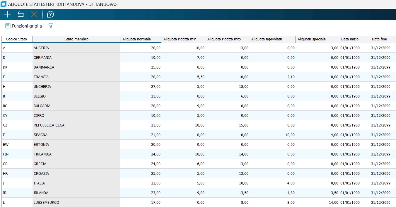 Nuova tabella comune\globale Aliquote IVA stati esteri in cui sono memorizzate le aliquote IVA vigenti nei paesi UE secondo le diverse tipologie di aliquota (denominato 'tipo aliquota'): normale, ridotta minima, ridotta massima, agevolata, speciale