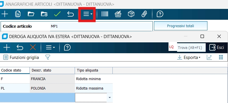 Inoltre per ogni articolo è possibile 'derogare' all'aliquota IVA standard stabilendo per ogni Stato estero l'aliquota da applicare. Tale tabella è accessibile dal menù Strumenti