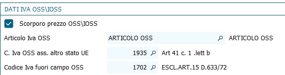 • Flag scorporo prezzo :va spuntato se il prezzo degli articoli che sono venduti in regime OSS\IOSS è già comprensivo dell'IVA estera e debba quindi essere scorporato della relativa aliquota; Abilitando tale flag si avrà lo scorpolo dell'iva anche sulle spese di piede del documento.