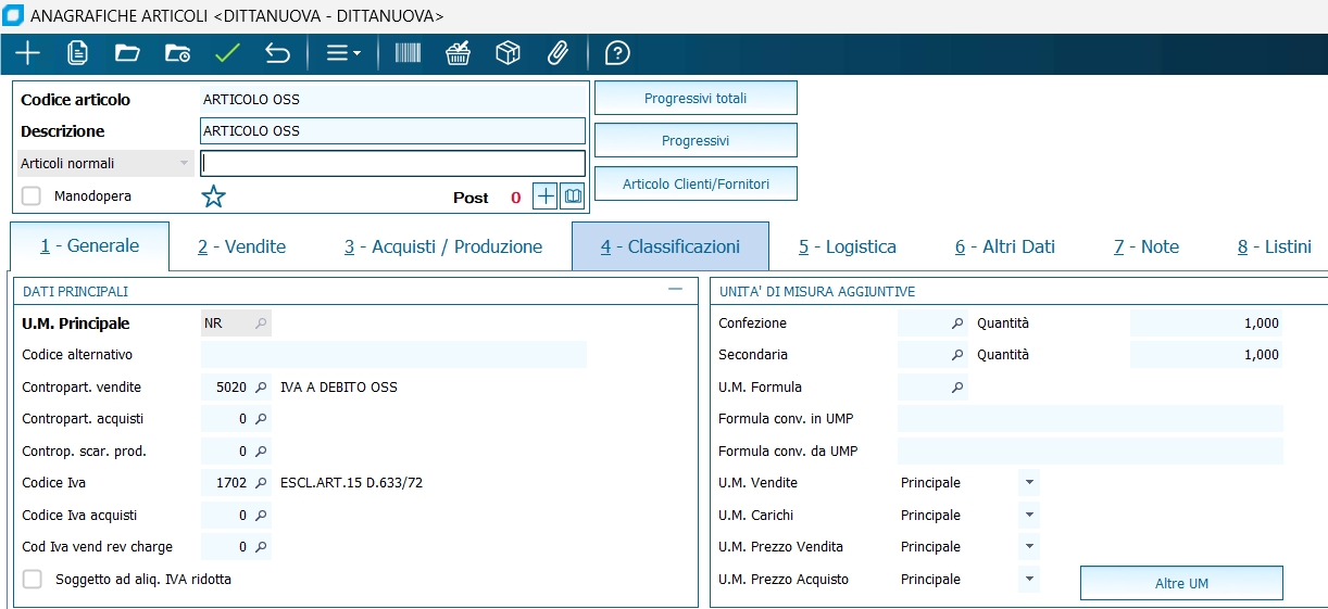Sul codice IVAOSS va impostata come contropartita vendite il conto patrimoniale IVA a debito OSS in cui andrà contabilizzata l'IVA estera addebitata in fattura e da versare con l'apposita liquidazione. In base a una risposta di interpello Nr del 2021 l'IVA estera può essere indicata o nel blocco AltriDAtiGestionali della fattura elettronica e quindi emettere una fattura che non comprenda l'importo dell'IVA estera. In alternativa, è possibile compilare un altro rigo del campo indicando l'importo dell'IVA estera applicata con il codice natura "N1" (Escluse art. 15 DPR 633/1972); in tal modo il totale fattura corrisponderà all'importo pagato dal cliente finale. In Business é gestito solo questa casistica