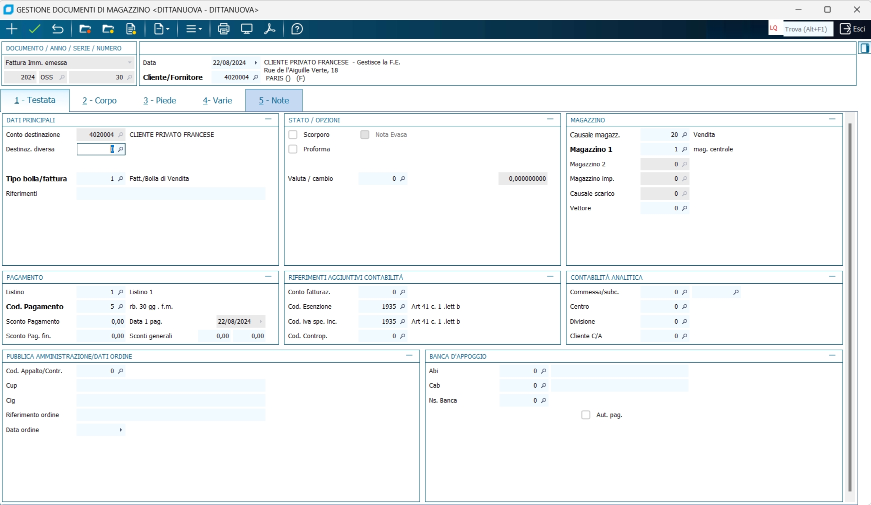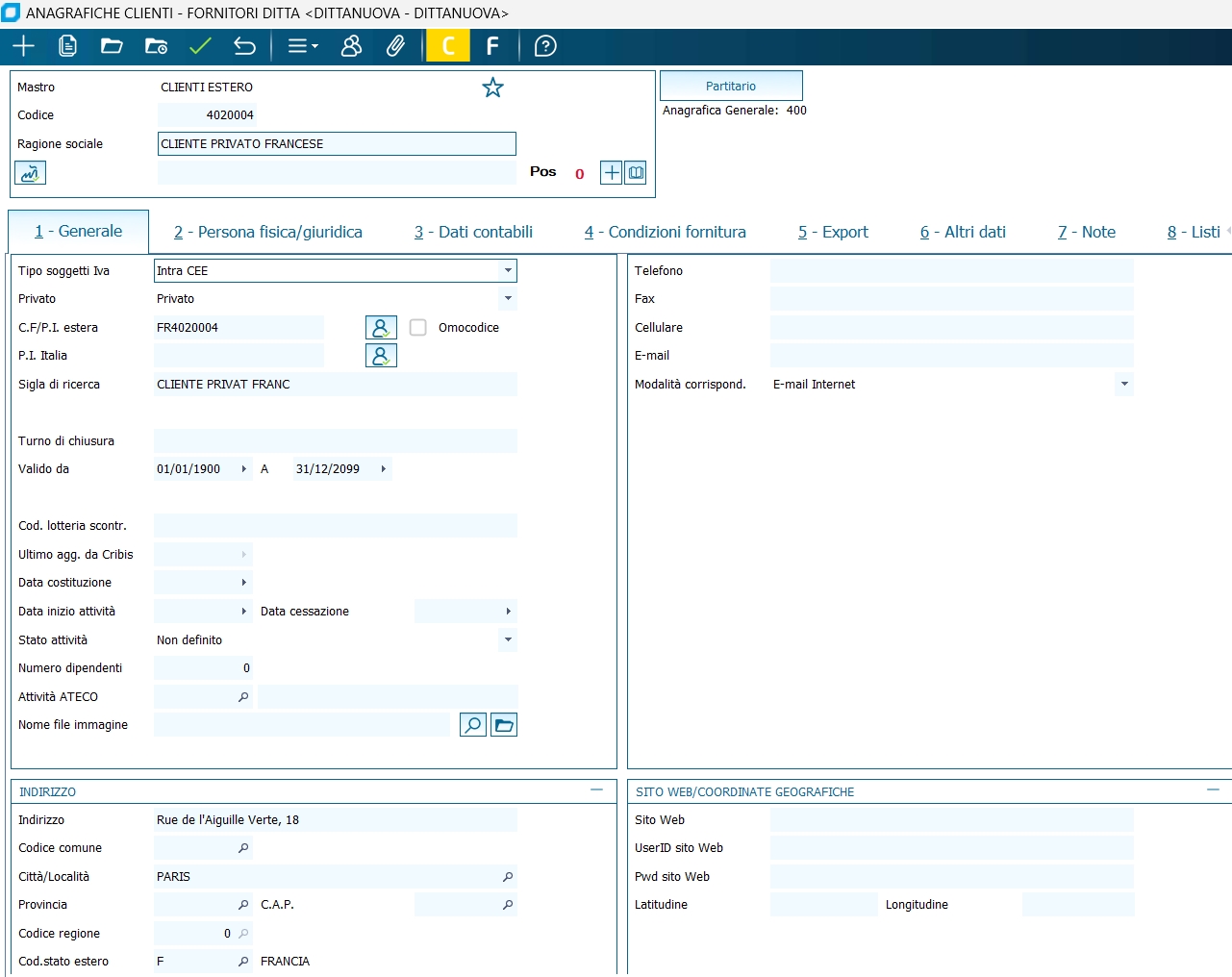 Creare le anagrafiche dei clienti privati UE: devono essere di tipo soggetto IVA Intrace e Privato. Lo Stato di appartenenza deve essere uno Stato della UE