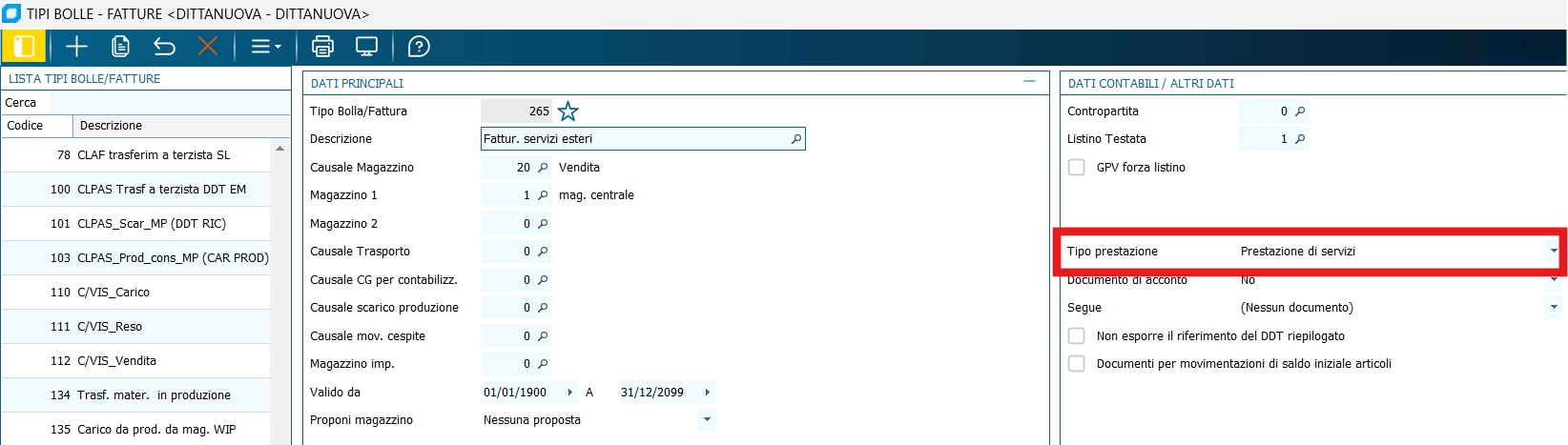 Se si gestiscono sia la cessione di servizi che le vendite a distanza codificare i tipi bolle fatture specificando il tipo prestazione: per i servizi specificare Prestazione di servizi