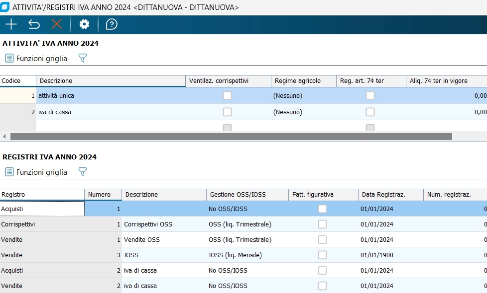 Dopo aver abilitato il modulo, in Anagrafica ditta\Dati IVA per anno\Dati generali ultimi registri IVA è presente un nuovo campo Gestione OSS/IOSS per identificare registri IVA sui quali sono contabilizzate le fatture coinvolte in tali regimi.