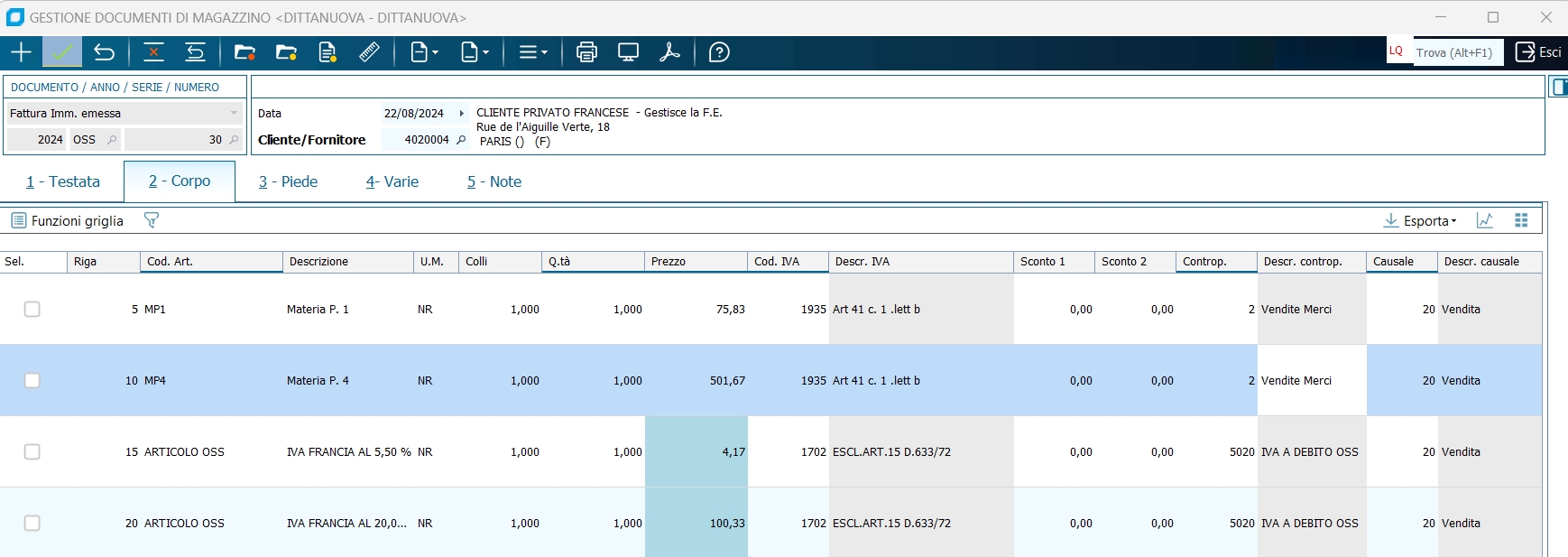 1. Previste due nuove colonne nella griglia del corpo in cui memorizzare l'aliquota IVA estera e l'imponibile IVA estero. Calcolo del prezzo di listino scorporato dell'IVA estera se in Tabella personalizzazione vendite è indicato che il prezzo deve essere scorporato o meno