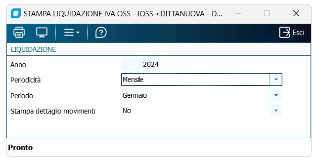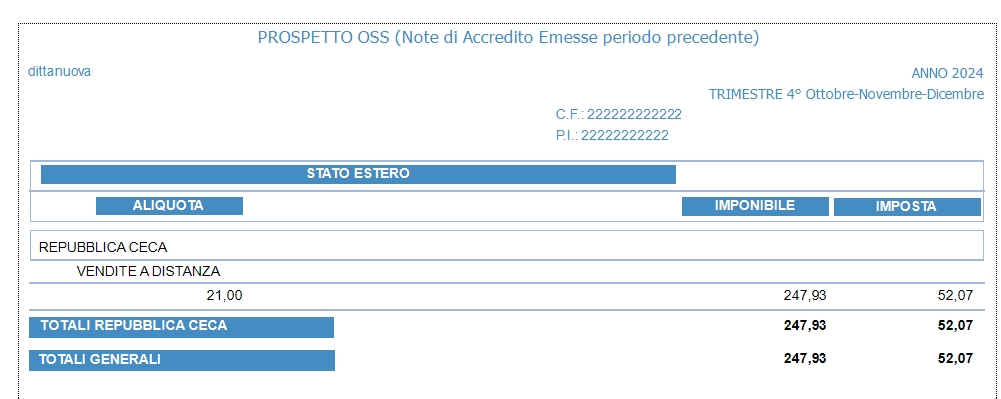 IL calcolo sarà fatto raggruppando per codice ISO stato estero e aliquota estera evidenziando i valori raggruppati di imponibile estero e IVA estera. I dati saranno esposti in una stampa che servirà per compilare la dichiarazione OSS/IOSS.