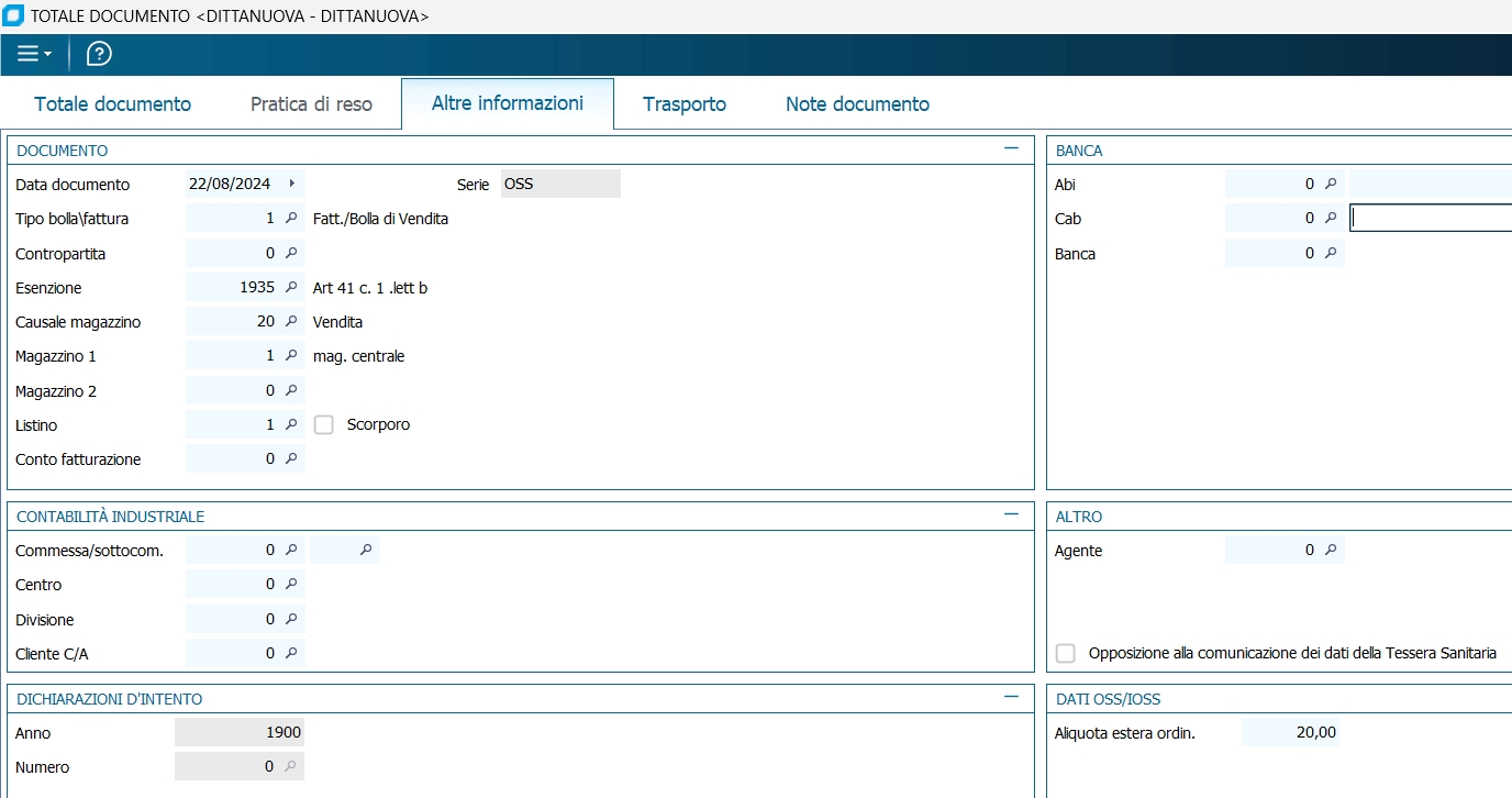 In fase di selezione del cliente/serie/tipo documento viene decretato se il documento è di tipo OSS e nel caso viene marcato come tale e la serie non sarà più editabile.