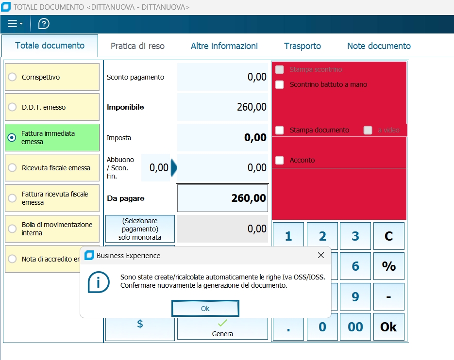 In fase di salvataggio del documento OSS/IOS (dopo aver cliccato su stampa/genera) vengono calcolate le righe relative all'imposta OSS/IOS e viene dato un messaggio informativo.