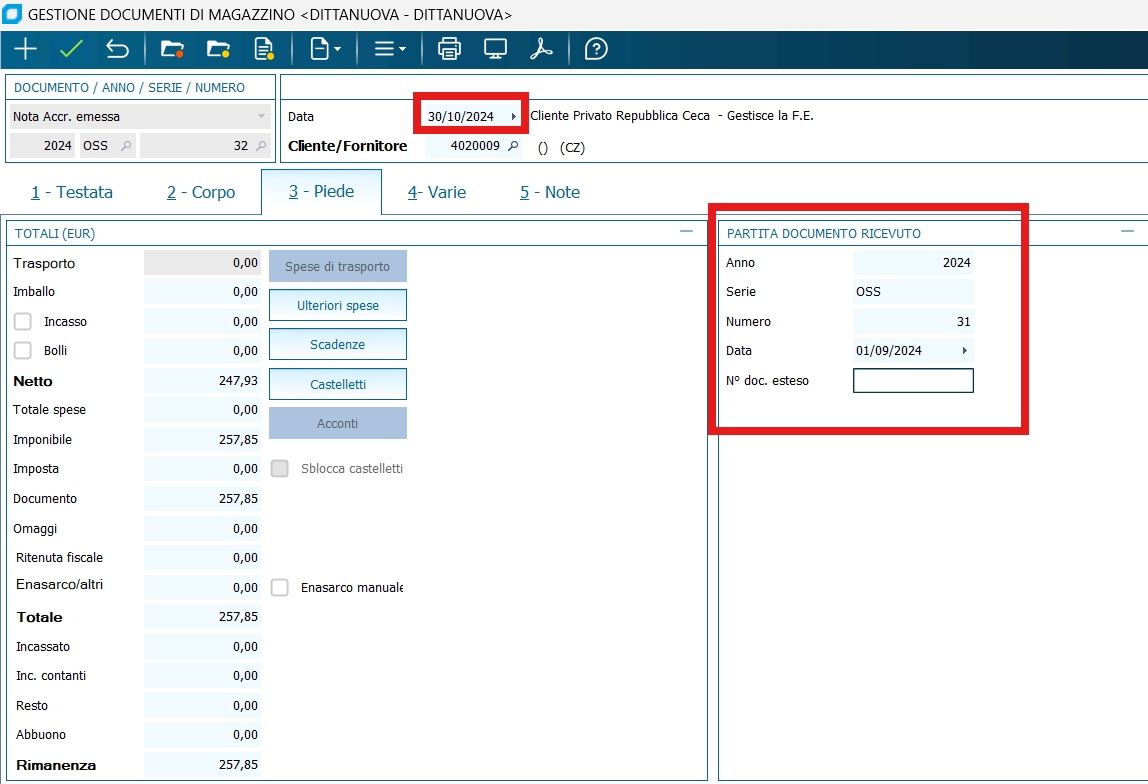 Per comprendere anche le note di accredito inserire negli estremi della partita il numero, la data, la serie della fatture cui si riferiscono. La data di competenza della nota di accredito sarà quindi la data della partita