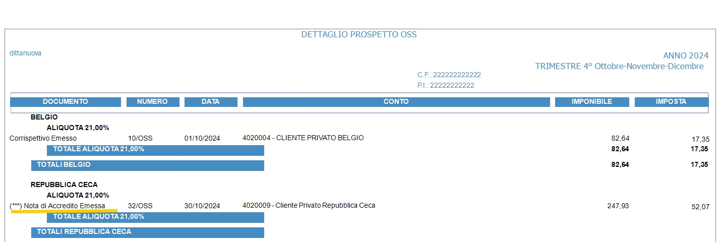 Allora nella stampa della liquidazione OSS/IOS (in questo caso trimestrale) verrà segnalata con l'asterisco perché trattasi di NC di trimestre precedente (BSOSLIQTD) e non verrà conteggiata nel trimestre di emissione (ott - nov - dic) ma deve rettificare il trimestre luglio - agosto - settembre e perciò verrà riportata in una stampa apposita del trimestre ott - nov - dic per le rettifiche del periodo precedente (BSOSLIQTN).