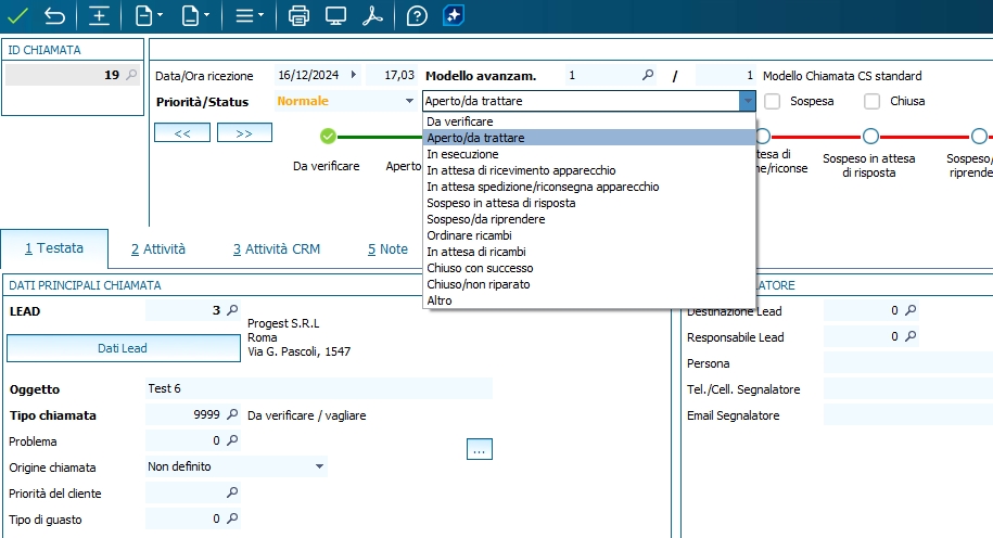 Sulla gestione chiamate, oltre al classico campo "Status" che consente di effettuare una scelta da un elenco di valori fissi e comuni a tutti gli interventi,