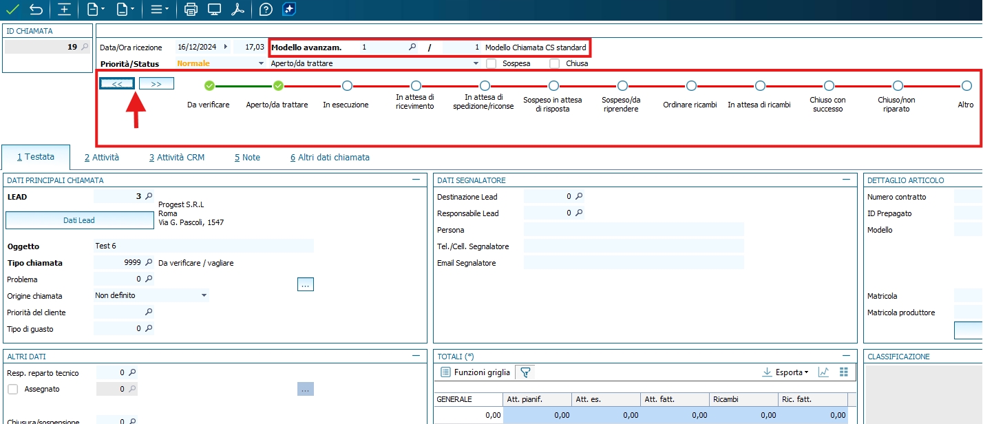 è stato introdotto un nuovo elemento di testata che permette di differenziare i percorsi di avanzamento per le diverse tipologie di chiamate gestite, mettendo a disposizione anche delle regole che permettono di vincolare il passaggio da uno stato all'altro.