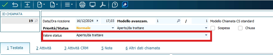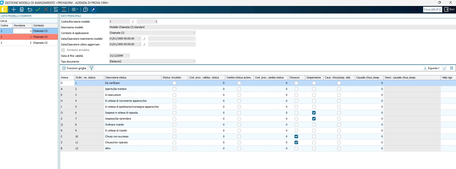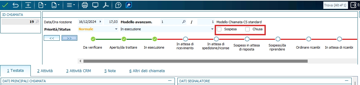 La possibilità di creare nuovi modelli di avanzamento, impone di identificare le chiamate "Chiuse" o "Sospese" con dei nuovi campi specifici (e non più con un valore particolare tra quelli disponibili nell'elenco del campo "Status").