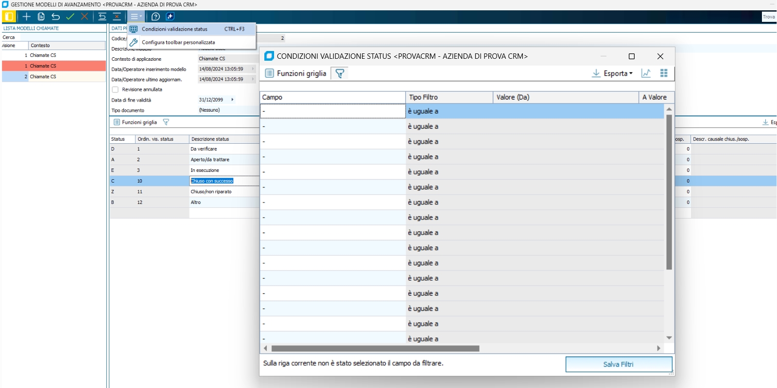 Le regole possono essere definite tramite la voce "Condizioni validazione Status" del menù "Strumenti", attingendo dai dati delle tabelle fondamentali gestite nella chiamata (Cliente, Estremi chiamata, Contratti, Parco Installato,etc.).