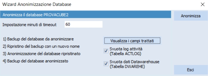 Tramite il pulsante "Visualizza i campi trattati" è possibile consultare quali campi del database saranno anonimizzati sul database selezionato.