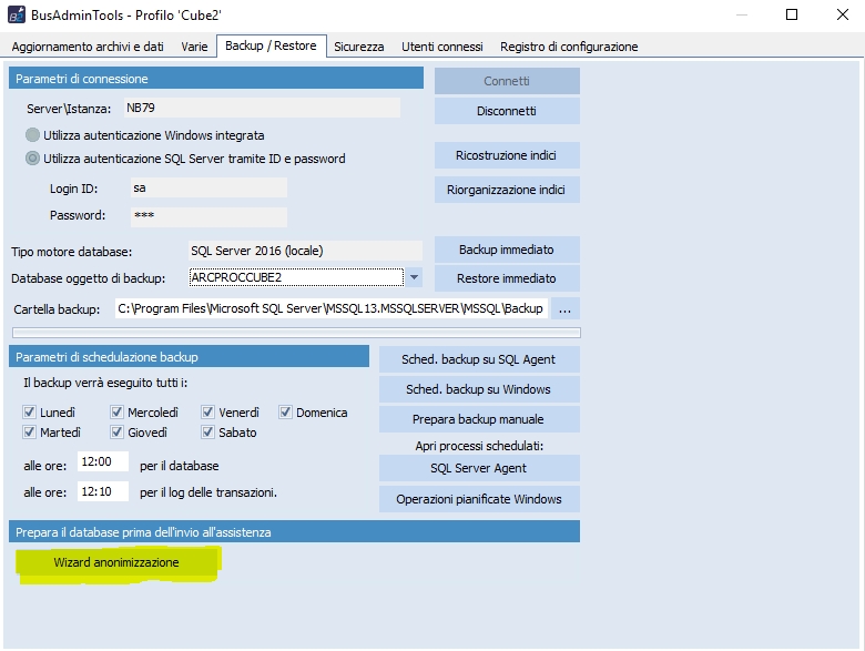 Per agevolare l'invio in assistenza dei database del cliente ed evitare la trasmissione dei dati personali, è stata aggiunta la nuova funzione "Anonimizzazione" su BusAdminTools, tab "Backup / Restore".