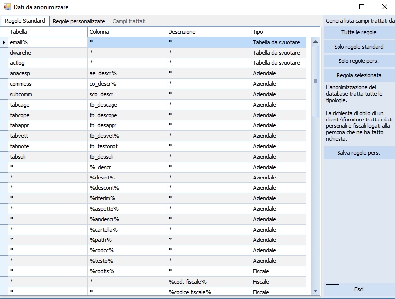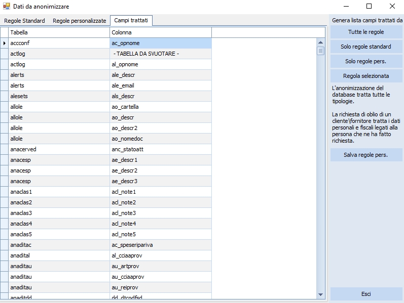Nel tab Campi trattati è mostrata la lista dei campi\tabelle presenti sul database che saranno trattati.