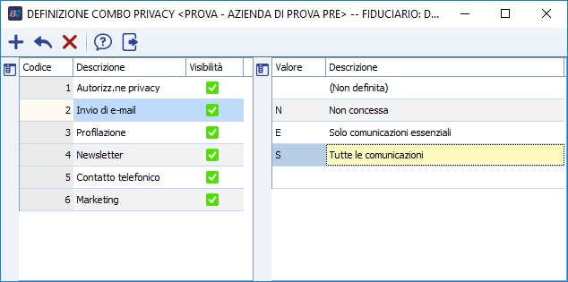 Il primo combo è associato al campo esistente di privacy, è anche parametrizzabile ma è obbligatorio che rimanga visibile.