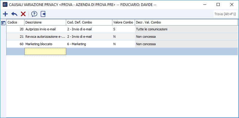 Il programma consente di definire delle causali di variazioni dei combo della Privacy, selezionando una causale il combo indicato assumerà il nuovo valore indicato.