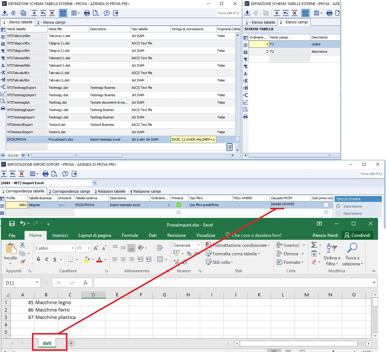 Codificare nella Definizione profili il profilo di importazione. Codificare nella Definizione schema tabella esterne il nome della tabella (identificatore univoco) e il nome del file XLS da cui importare, indicando come Tipo tabella "Jet o altri Jet ISAM" e come Stringa di connessione "EXCEL 8.0;HDR=No;IMEX=1" o "Excel 12.0;HDR=No;IMEX=1" (senza doppi apici). La direttiva "IMEX=1;" indica al driver Excel ISAM di usare la modalità Import, la quale utilizza i parametri di registro di Windows descritti più sotto. Nell'Elenco campi si definiscono nell'ordine i nomi dei campi F1, F2, F3, F4, ... corrispondenti alle colonne dell'area da importare. I campi saranno tipizzati in base al contenuto dei dati in ogni singola colonna. Nella Impostazione Import/Export si crea la corrispondenza tabelle col nome della tabella di Business (da scrivere) e la tabella esterna (file XLS); nella colonna Clausola FROM si indica ad esempio "[NomeFoglio$A1:E100]" dove va indicato esplicitamente il nome del foglio e l'area in cui leggere i dati da importare. Ovviamente il numero delle colonne selezionate deve corrispondere al numero dei campi definiti nello Schema tabelle esterne. Per quanto riguarda le righe, invece, indicare un range di righe sufficientemente ampio per evitare che import successivi con più dati non importino tutti i record. Le eventuali righe vuote finali non vengono importate. Se nella prima righa sono indicati i nomi delle colonne scartare la prima righa dal range di selezione (ad esempio [NomeFoglio$A2:E100]).
