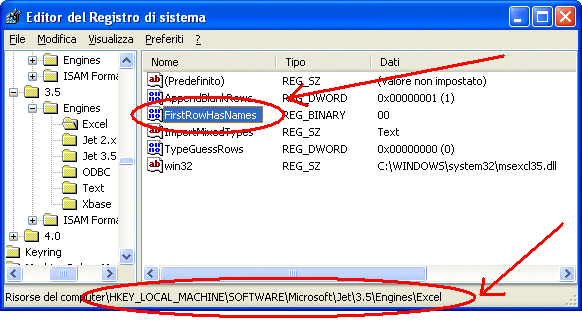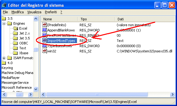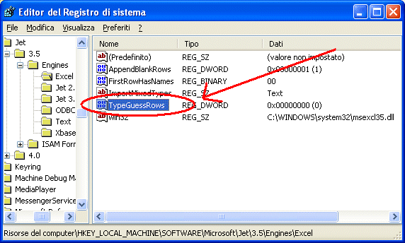 Modifica alla chiave di registro Sulla macchina in cui si esegue l'importazione occorre modificare le seguenti opzioni di registro sotto la cartella HKEY_LOCAL_MACHINE\SOFTWARE\Microsoft\Jet\3.5\Engines\Excel (per Excel 97) e sotto la cartella HKEY_LOCAL_MACHINE\SOFTWARE\Microsoft\Jet\4.0\Engines\Excel (per Excel 2000 e successive versioni) NB: per le macchine a 64bit tale percorso si trova sotto: