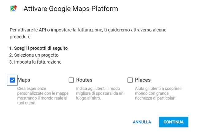 Ci connettiamo all'indirizzo di GOOGLE MAPS . Attiviamo la Google Maps Platform