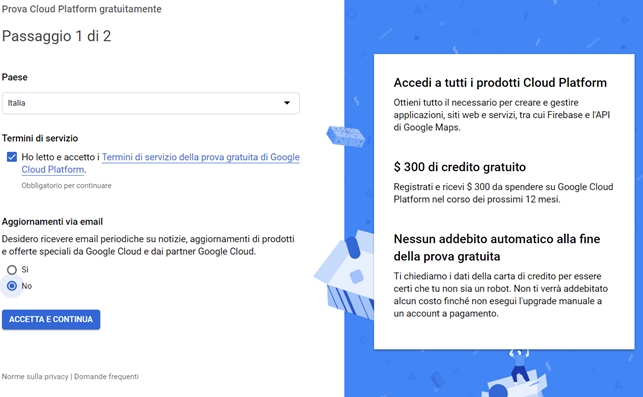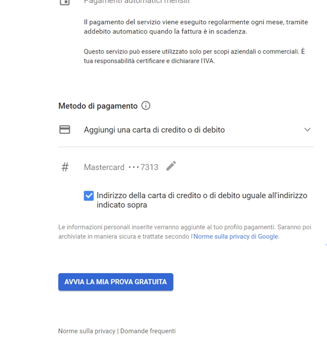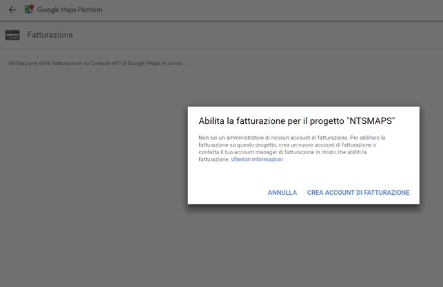 Viene richiesto il tipo di fatturazione, clicchiamo su Crea account di fatturazione