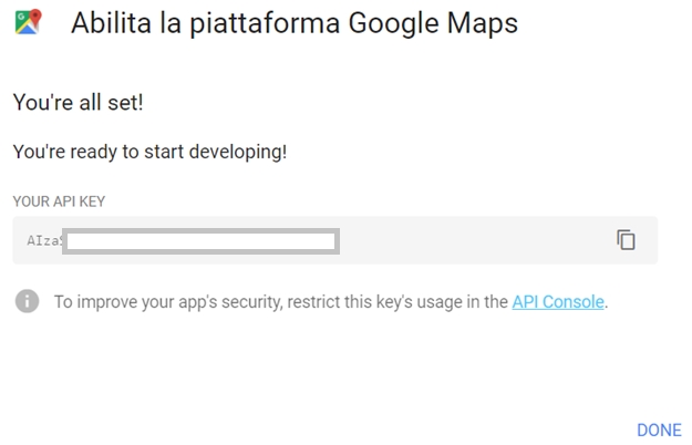 Viene a questo punto creata la API Key, utilizzabile in Business o nei propri siti internet.