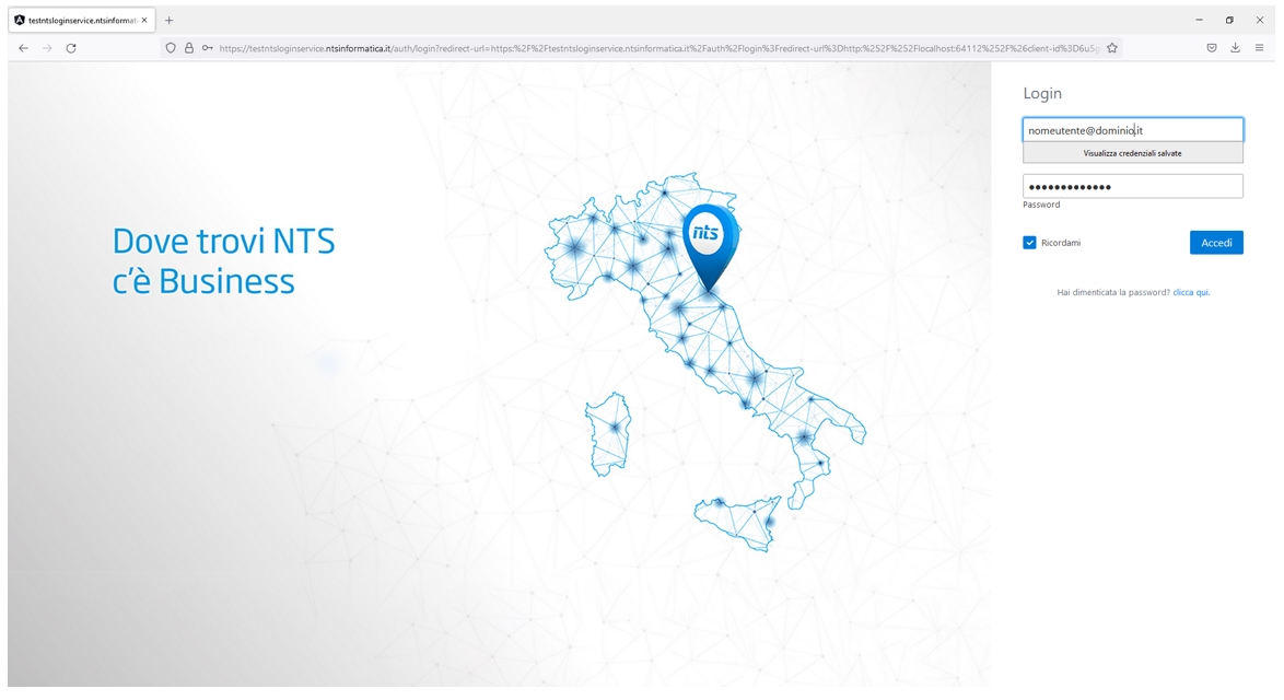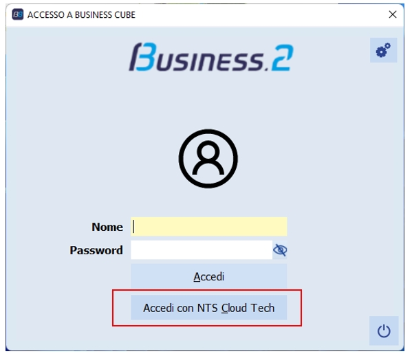 Settate queste due impostazioni, dalla schermata di login di Business viene abilitato il pulsante di login Accedi con NTS Cloud Tech con le quali occorre loggarsi: