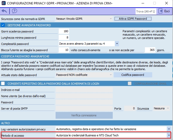 1. Dal menù 1-O-D "Configurazioni Privacy GDPR" verificare che il campo Metodo di accesso sia impostato ad Autorizza le credenziali Business e NTS Cloud Tech: