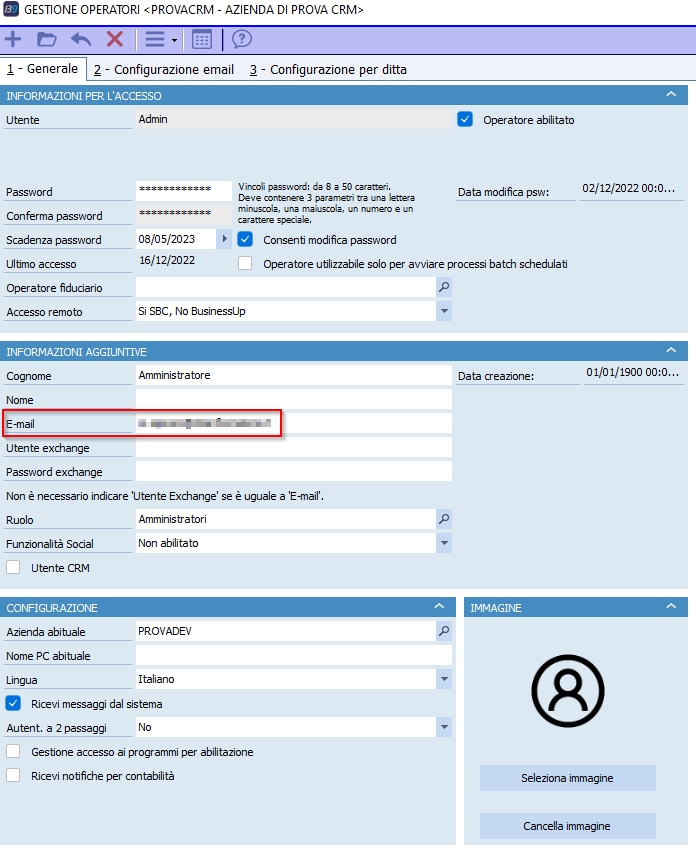 2. Dal menù 1-O-3 Gestione Operatori verificare che il campo E-mail dell'orperatore sia lo stesso registrato sul portale NCT: