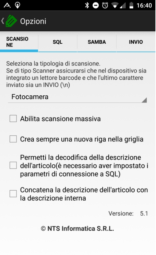 Lo spinner "Seleziona la tipologia di scansione..." permette di decidere la modalità di scansione, se tramite fotocamera o tramite lettore scanner, entrambi integrati nel dispositivo. Nel caso di scansione tramite "Fotocamera" apparirà, nell'applicazione, il tasto "Scansiona", mentre, nel caso di scansione tramite "Lettore barcode integrato" il tasto "Scansiona" sarà invisibile. Il checkbox "Abilita scansione massiva" permette di lanciare al termine di una scansione direttamente l'applicazione di lettura barcode per velocizzare al massimo la velocità nella lettura multipla di barcode. Per tornare all'applicazione NTSArti è necessario premere il tasto (fisico/soft touch) indietro del dispositivo. Il checkbox "Crea sempre una nuova riga nella griglia" fa sì che se vengono scansionati N volte lo stesso articolo vengono create N righe con quantità a 1. Viceversa se non selezionato se scansioniamo N volte lo stesso articolo viene creata una sola riga con quantità N. Il checkbox "Permetti la decodifica della descrizione dell'articolo.." permette di eseguire una query SQL su Business sulla ditta impostata per recuperare anche la descrizione e visualizzarla sulla griglia. Questa opzioni ha la necessità di aver impostato correttamente la connessione SQL e di essere collegati alla wireless. Il checkbox "Concatena la descrizione dell'articolo con la descrizione interna" permette di visualizzare una descrizione estesa dell'articolo concatenando le due descrizioni presenti in anagrafica.