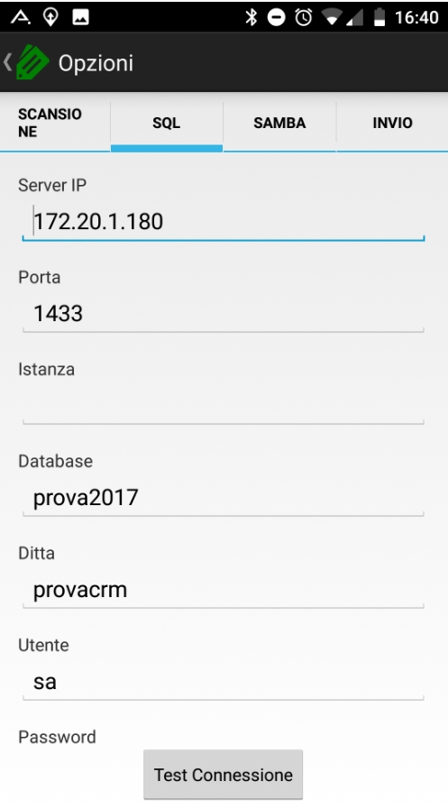 Il campo "Server IP" è l'IP del server di SQL all'interno della nostra wireless. Il campo "Porta" è la porta a cui risponde il servizio SQL server. Il campo "Istanza" permette di specificare una eventuale istanza, se presente. Il campo "Database" è il nome del database di SQL server a cui collegarsi. Il campo "Ditta" rappresenta la ditta di Business su cui si vuole operare Il campo "Utente" è il nome dell'utente che può accedere al database. Il campo "Password" è la password dell'utente inserito nel campo "Utente. Tramite il bottone "Test Connessione" possiamo verificare che tutto sia andato a buon fine. Sia in caso di connessione riuscita che di errore verrà visualizzato a video un messaggio con il dettaglio.