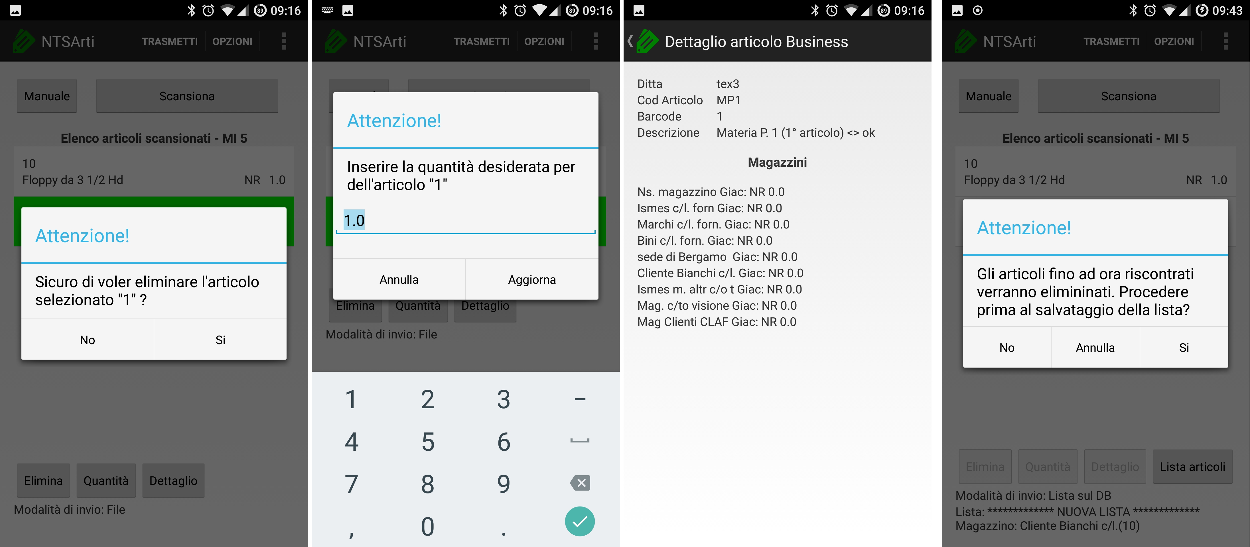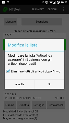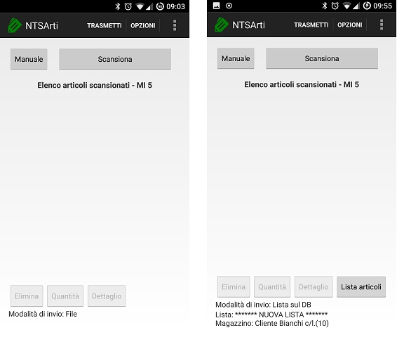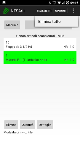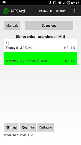 La riga attualmente selezionata è evidenziata in verde. Con i bottoni presenti nella parte sottostante la griglia è possibile: - Elimina: cancellare l'articolo dalla griglia, questa operazione non potrà essere ripristinata - Quantità: modificare la quantità dell'articolo - Dettaglio: visualizzare il dettaglio articolo con i dati scaricati da business, per questa funzione è necessario aver impostato la connessione SQL (vedi sezione OPZIONI) ed essere collegati alla wireless - Lista articoli: questo bottone è visibile solo se nelle opzioni di invio è stato impostata la modalità di invio "Lista sul DB". Cliccando sarà possibile decidere se inviare gli articoli riscontrati o eliminarli