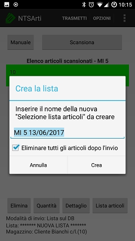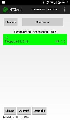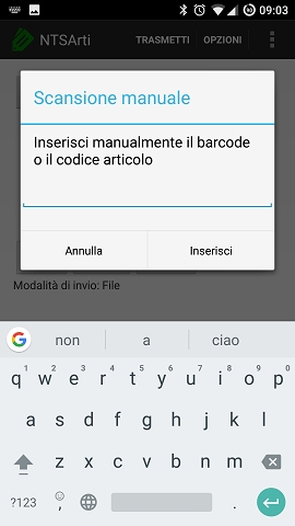 Nella parte sottostante è visibile un riassunto delle impostazioni utilizate per l'invio degli articoli riscontrati. La modalità di invio, modificabile nelle opzioni, modifica l'interfaccia di NTSArti. Alla voce Elenco articoli selezionati – NOMEDISPOSITIVO è possibile visualizzare il nome attuale del device. E' possibile modificarne il nome nelle (vedi sezione OPZIONI DI INVIO). E' possibile effettuare tre tipi di scansioni, quella manuale (bottone "Manuale"), quella con fotocamera (bottone "Scansiona") o quella con lettore scanner abilitando la voce relativa nel menu opzioni (vedi sezione OPZIONI). Con la scansione manuale verrà richiesto di inserire manualmente il barcode: