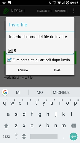 Trasmetti Il bottone "TRASMETTI" presente nella barra in alto, permette di inviare la lista scansionata a Business in base alle modalità di invio settata nelle opzioni (Vedi sezione OPZIONI INVIO). Invio tramite File Nel caso si utilizzi l'invio tramite file, verrà generato un file di testo (.txt) in una cartella condivisa su una cartella condivisa su un PC raggiungibile dal dispositivo in uso. Per utilizzare questa funzione è necessario aver configurato le opzioni di connessione al SAMBA ed essere connessi alla rete wifi (vedi sezione OPZIONI). Nella schermata verrà richiesto il nome del file (di default è il modello dello smartphone) e se vogliamo che al termine venga svuotata anche la lista locale, in modo da poter ricominciare con la lista vuota con un novo batch di prodotti da scansionare