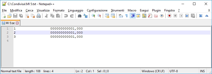 E all'interno vediamo il file appena trasmesso dall'applicazione. Il contenuto del file è di tipo lunghezza fissa dove ogni riga è composta da: - Barcode (18 caratteri) - Quantità (16 caratteri con 3 decimali)