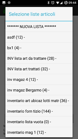 Cliccando "**** Nuova Lista ****" si abilita la modalità di inserimento, mentre cliccando su una lista si abiliterà la modalità di modifica. Le liste vengono visualizzate ordinate per nome terminale e nome. Nel caso di "**** Nuova Lista ****", verrà generata su Business una nuova lista di "Selezione articoli" con l'elenco di tutti gli articoli riscontrati. Verrà richiesto il nome della lista (di default il nome del dispositivo più la data attuale). La lista avrà come magazzino quello inserito nelle opzioni (vedi sezione OPZIONI DI INVIO). Per utilizzare questa funzione è necessario aver configurato le opzioni di connessione a SQL Server ed essere connessi alla rete wifi (vedi sezione OPZIONI SQL).