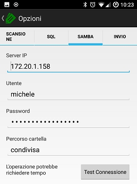 Il campo "Server IP" è l'IP del PC samba all'interno della nostra wireless su cui vogliamo copiare il file da trasmettere con la lista. Il campo "Utente" è il nome dell'utente per accedere al PC. Il campo "Password" è la password dell'utente inserito nel campo "Utente. Il campo "Percorso cartella" è il percorso della cartella su cui vogliamo copiare il file. Questa cartella deve essere condivisa in rete e visibile Tramite il bottone "Test Connessione" possiamo verificare che tutto sia andato a buon fine. Se la connessione è riuscita all'interno della cartella un file chiamato "testConnection" con all'interno la data dell'ultimo test di connessione.