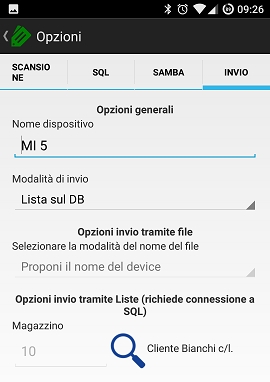 Nome del dispositivo proposto durante l'invio della lista. Lo spinner "Selezionare la modalità di invio" permette di scegliere la modalità di invio degli articoli riscontrati a Business. E' possibile inviare gli articoli tramite File (richiesta configurazione SAMBA) oppure tramite "Lista sul DB" (inserimento o aggiornamento). In questi due ultimi casi è richiesta la configurazione SQL per per creare/aggiornare la lista. In base alla modalità di invio scelta si abiliteranno/disabiliteranno alcune opzioni sottostanti che consentono di selezionare tramite ZOOM il magazzino da utilizzare. Nel caso si utilizzi la modalità file verrà abilitato lo spinner per selezionare la modalità del nome del file.