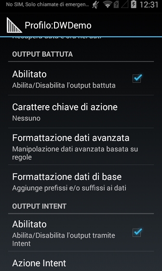 Lo spinner "Proponi nome del device" permette preimpostare il nome del file con lo stesso nome del device quando effettuiamo la trasmissione del file. Viceversa è possibile non voler proporre il nome del device e quindi inserirlo manualmente. Configurazione Scanner Barcode (dipende dal dispositivo) Per utilizzare la funzione di lettura tramite barcode è necessario avere un dispositivo con lo scanner incorporate ed aver configurato che ad ogni lettura di barcode invii un carattere di INVIO (\n) all'applicazione. Nel caso del dispositivo "ZEBRA TC55" è sufficiente avviare l'applicazione già installata sul dispositivo che si chiama "DataWedge". Creare o modificare un profilo (nel nostro caso utilizzeremo il default). Spuntare nella sezione "OUTPUT BATTUTA" la voce "Abilitato" e cliccare su "Formattazione dati di base".