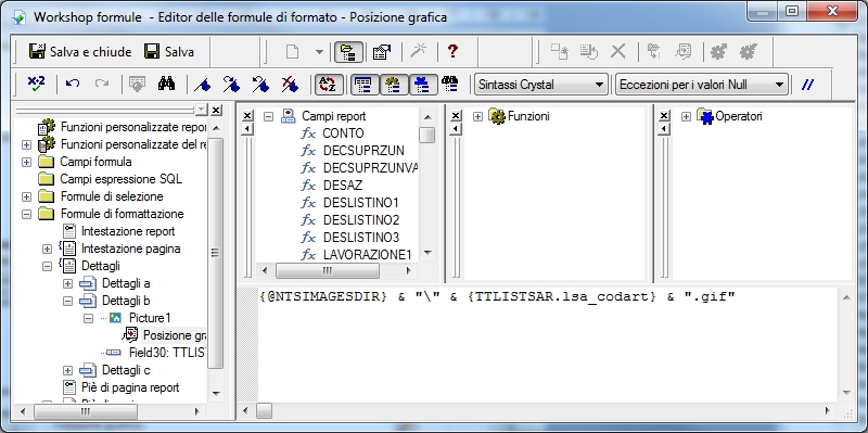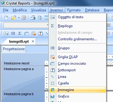 Esempio di come inserire un immagine variabile tramite la formula NTSIMAGESDIR Come prima cosa occorre aprire il report da personalizzare e creare la formula 'NTSIMAGESDIR', poi procedere ad inserire un'immagine all'interno del report.