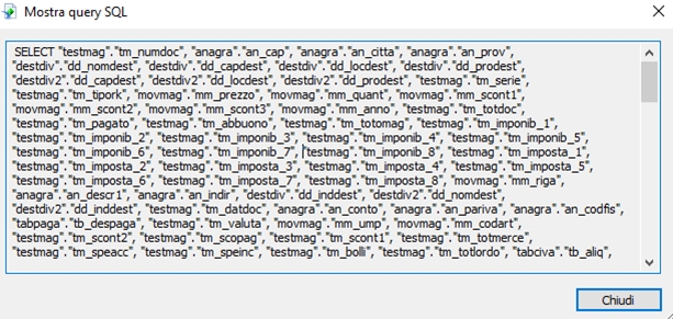 A questo punto nel report si possono aggiungere i campi come se fosse una normale tabella. Record Selection/Group Selection/Saved Data (Crystal Reports) In alcune circostanze potrebbe essere comodo (per non personalizzare un programma) o necessario (ai fini di un miglioramento delle prestazioni del report) effettuare un'ulteriore selezione dei dati successiva a quella derivante da Business e visualizzabile da Database | Mostra Query SQL (Database | Show SQL Query):