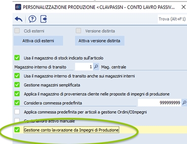 Genera ddt emessi a terzista a partire dagli impegni di produzione ereditandone i riferimenti oppure permette di associare i riferimenti agli impegni di produzione inserendo ddt emessi a terzista. Questa gestione del conto lavoro passivo si attiva tramite un nuovo flag presente in personalizzazione di produzione (1-A-C):