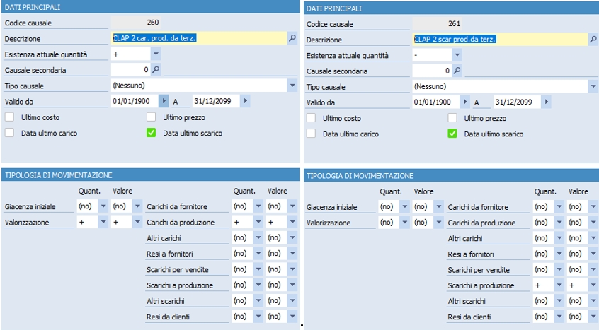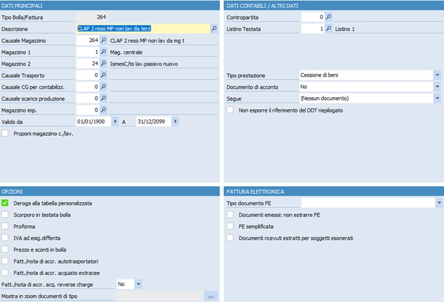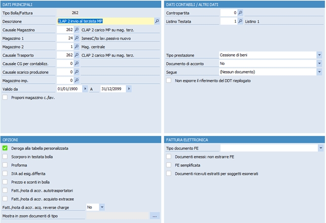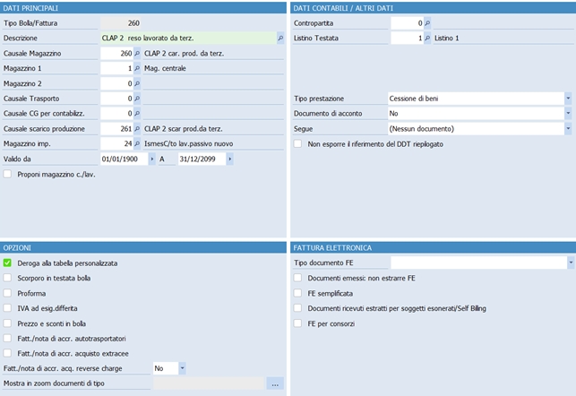 Impostare un magazzino per ogni terzista: • Tipo magazzino = Merce propria presso terzi • Conto C/F = conto fornitore / terzista • Nuovo flag «C/to Lav.pass. Da I.P.» Nel database di prova sono state implementati i tipi BF per la nuova gestione: • DDT EMESSO invio materiali a terzista in conto lavoro: tipo bf 262 = CLAP 2 invio al terzista MP • CARICO DI PROD.DA TERZISTA - RESO C/TO LAVORO: tipo bf 260 = CLAP 2 reso lavorato da terz. • DDT RICEVUTO DI RESO NON LAVORATO: tipo bf 264 = CLAP 2 reso MP non lav da terz. DDT EMESSO A TERZISTA: INVIO MATERIALI IN CONTO LAVORO (tipo bf 262)