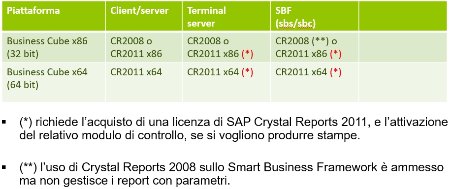 • Per la fruizione di Business nella modalità "server" (*) è richiesto l'acquisto di una licenza di SAP Crystal Reports 2011 (l'editor dei report) per ogni installazione, in seguito a variazioni delle condizioni di fornitura da parte di SAP